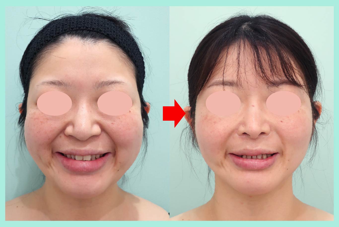 たるみ感は悪化しておらず、巣スッキリ感がキープされていますね☆ 糸リフトで癒着が起きているので、しっかりと吸引していても弛みが進行していませんね。ほうれい線も改善されていて、良い状態ですね。