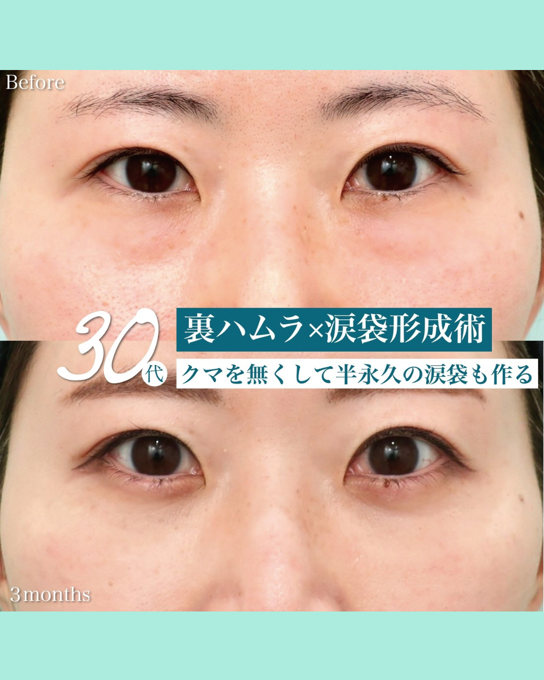 裏ハムラ+涙袋形成の術前と術後(3ヶ月)の症例写真