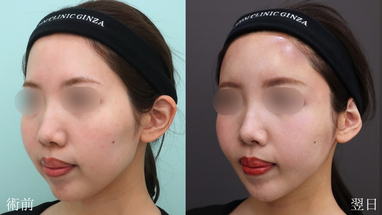 顎下広め・ジョールファットの脂肪吸引+額・こめかみ・頬コケへの脂肪注入の術前と術後(翌日)の症例写真『【劇的変化】脂肪吸引×脂肪注入でここまで変わる・輪郭トータルアプローチ』の画像